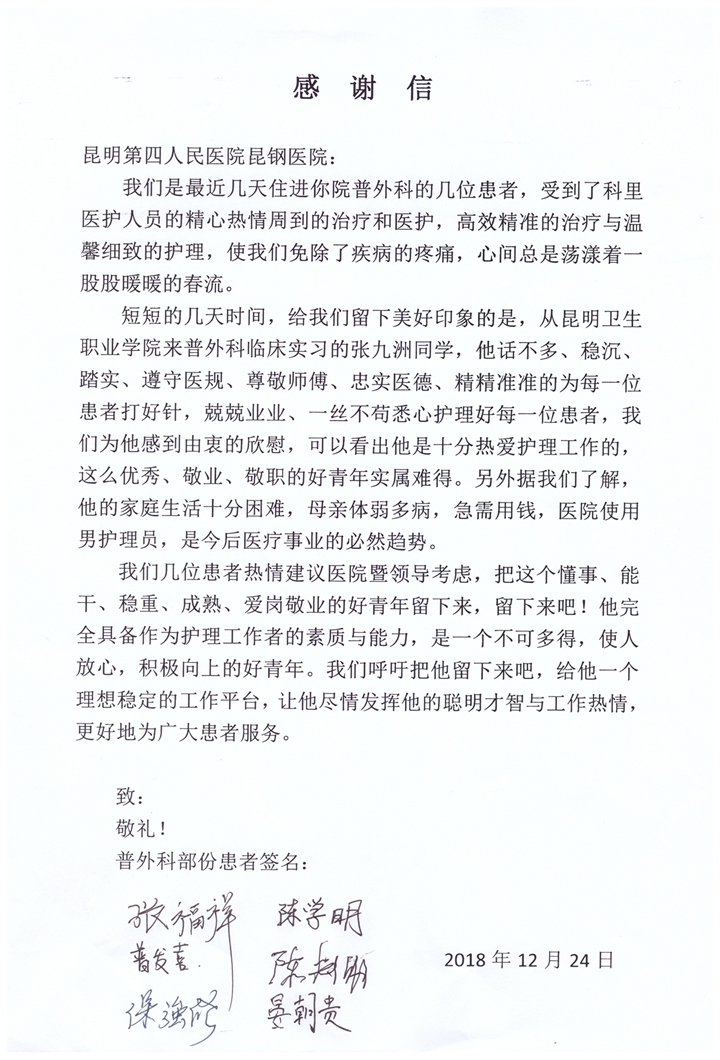 导语:医学也是人文科学,医生有了温度,医学也就彰显了温暖之本色。我院护理专业张九洲同学在昆明市第四人民医院(昆钢医院)普外科因其实习工作突出,收到病人联名书写的感谢信和推荐信,他为学院实习生树立了良好的医者仁心的形象,展现了我院学子扎实的医学技能和优良服务意识的风采。希望全院实习生向他学习,学习他树立服务意识、一切为了病人的服务理念,学习他甘于奉献、关爱病人的良好作风,以实际行动践行医学生誓言,为弘扬社会主义核心价值观献出自己的一份力量!
