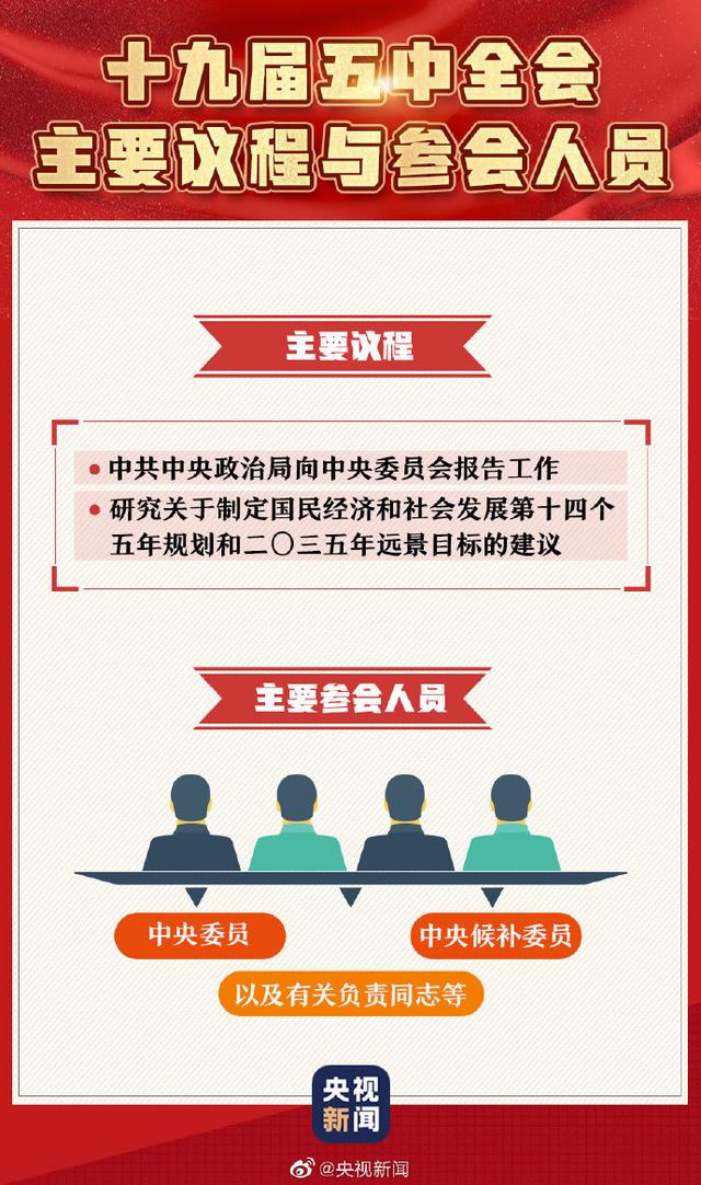 中国共产党第十九届中央委员会第五次全体会议,于10月26日至29日在北京举行。主要议程是,中共中央政治局向中央委员会报告工作,研究关于制定国民经济和社会发展第十四个五年规划和二〇三五年远景目标的建议。今天,一组图带你了解十九届五中全会↓↓