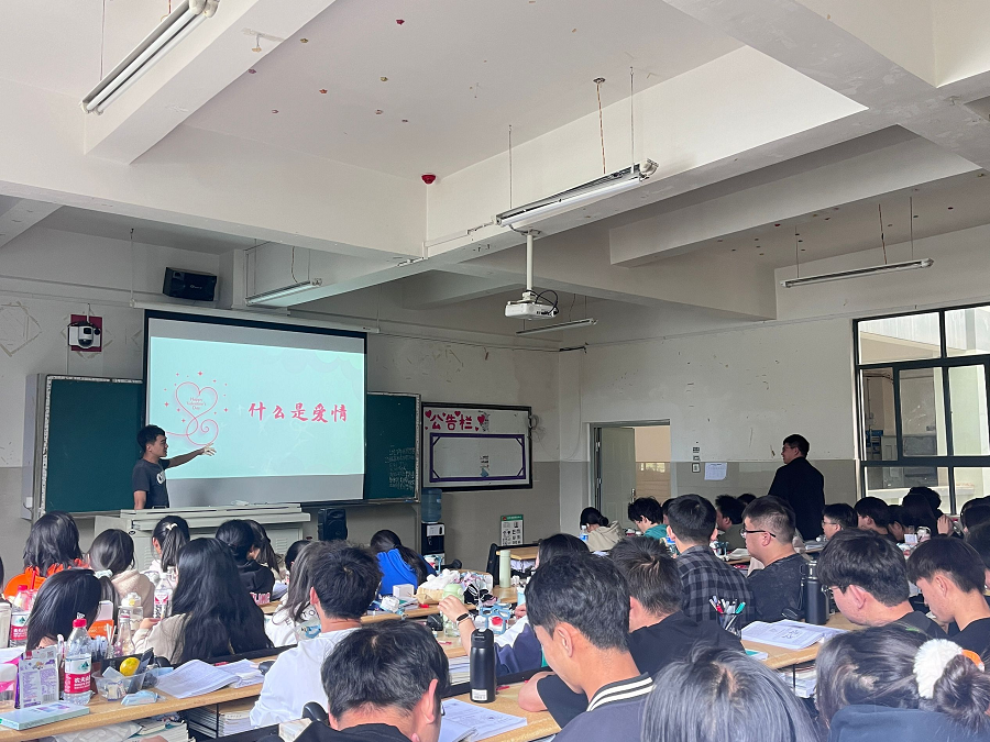 辅导员问:“什么是爱情?”同学们回答了自己对爱情看法。而后辅导员又结合自身经验跟学生们讨论了自己的看法。老师说到:爱情是受社会因素影响的生理、心理和主观情感结合的复杂现象,不同时代、文化、学科和学者们对爱情有着不同的理解和定义。现代定义为两个人基于一定的物质条件和共同的人生理想,在各自内心形成的对对方的最真挚的仰慕,并渴望对方成为自己终生伴侣的最强烈、最稳定、最专一的感情。但在远古的母系社会、古代的父系社会,爱情有另一种体验,并不是单纯的一夫一妻制。爱是生命的渴望,情是青春的畅想,爱情的意义在于:让智慧和勤劳酿造生活的芳香,用期待与持守演绎生命的乐章,用真诚和理解还有包容和信任去谱写人生的信仰。